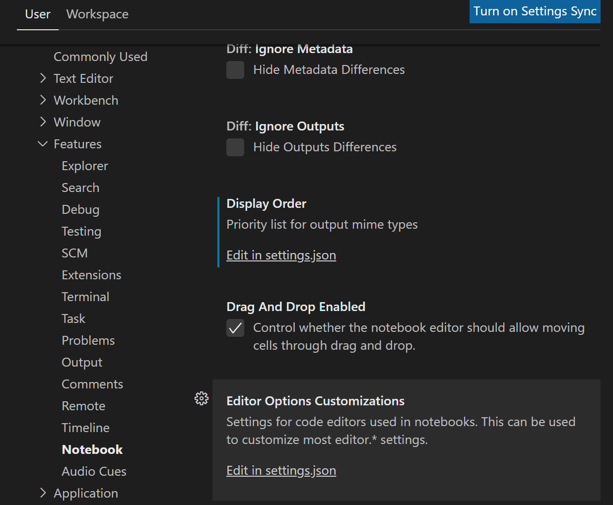 Settings -> Features -> Notebook -> Editor Options Customizations
